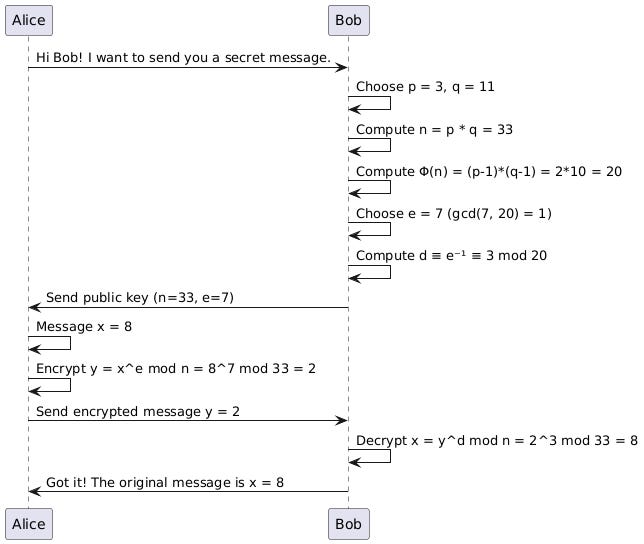 Bob's private key(3)Then, Alice want to send to Bob a message x = 8. She get Bob’s public key (33,7) and compute: